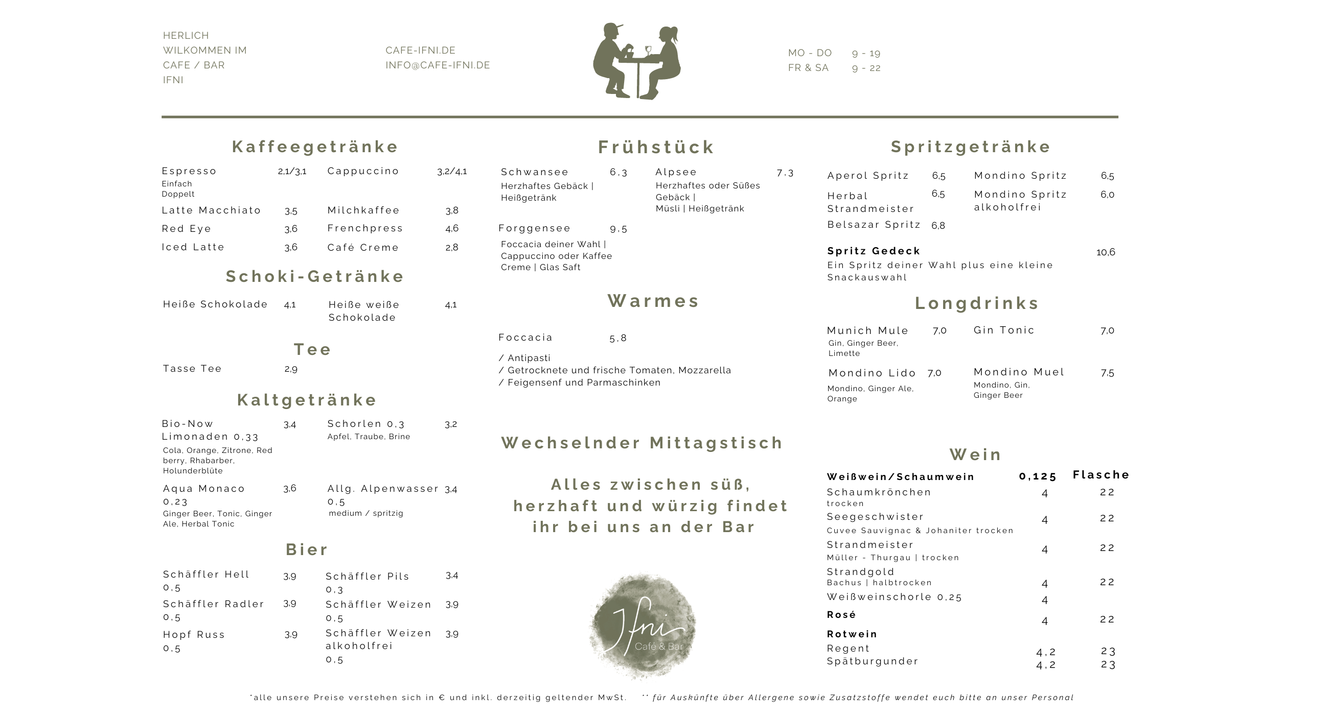 Karte Karte Team Ifni 03 Sep. 2023 • 1 Min. Lesezeit Diese Leckereien könnt ihr von früh morgens bis spät bei uns genießen. Unseren aktuellen Mittagstisch findest du hier.Karte Ifni Karte Ifni Karte-Ifni.png 391 KB download-circle